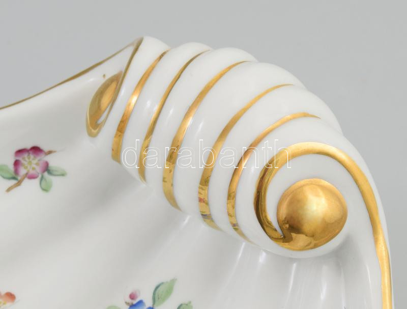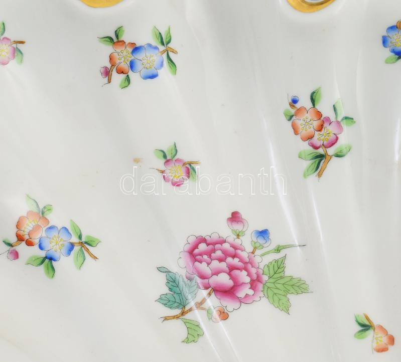 Beschreibung: Herendi kagyló alakú virágmintás kínáló. Kézzel festett, jelzett, kis kopással 24x22 cm
