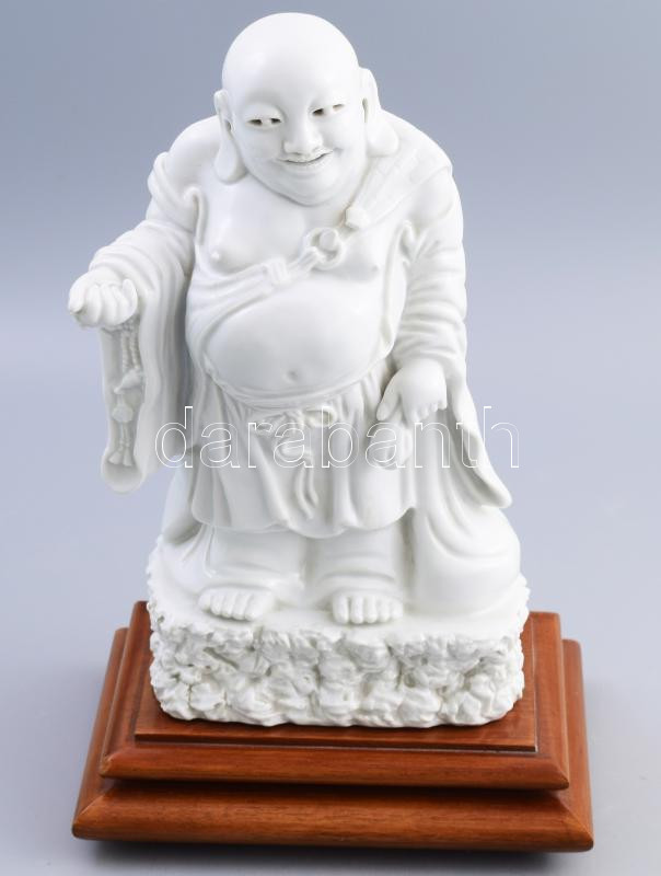 Beschreibung: Herendi nevető Buddha. Jelzett, mázas fehér porcelán, kis kopással, fa talapzaton, teljes m: 33,5 cm