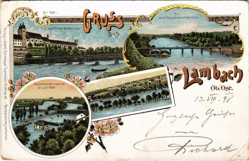 1898 (Vorläufer) Lambach, Wasserkatastrophe am 31. Juli 1897. Die neue Notbrücke, Die neue Eisenbahnnotbrücke / flood, emergency bridge and emergency railway bridge. Josef Reinegger Art Nouveau, floral, litho (EB)