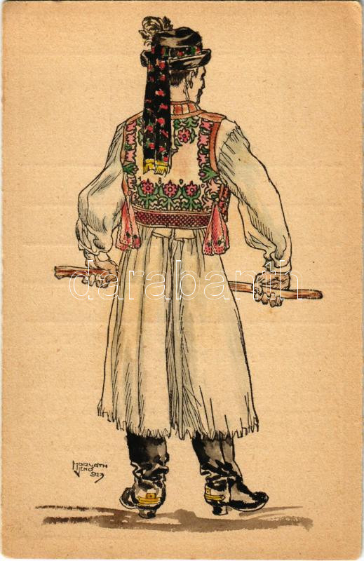 Körösfő, Izvoru Crisului (Kalotaszeg, Tara Calatei); Kalotaszegi legény (Körösfő). Erdélyi folklór művészlap / Transylvanian folklore art postcard. Orbis Pictus Hungaricus. 4. s: Horváth Jenő (EK)