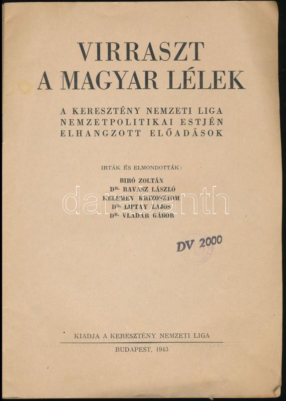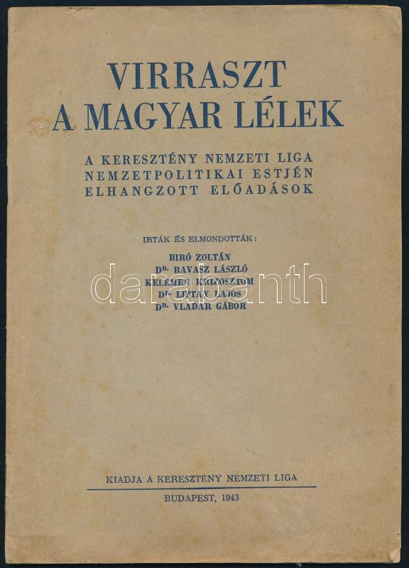 Virraszt a magyar lélek. A Keresztény Nemzeti Liga nemzetpolitikai estjén elhangzott előadások. Írták és elmondották: Bíró Zoltán, Dr. Ravasz László, Kelemen Krizosztom, Dr. Liptay Lajos, Dr. Vladár Gábor. Bp., 1943., Keresztény Nemzeti Liga,(Athenaeum-ny.), 29 p. Kiadói papírkötés, kissé foltos borítóval.