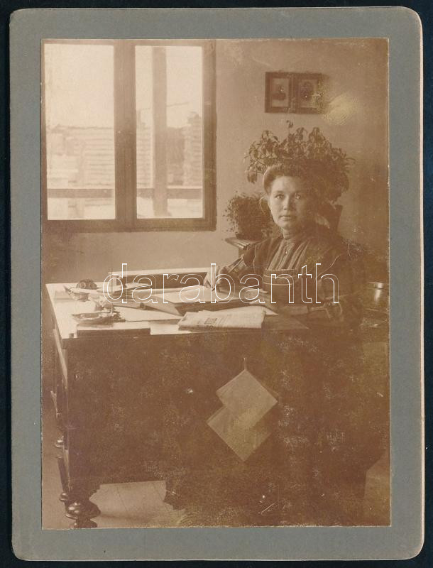 Beschreibung: 1908 Újszentanna (Sântana), Erdély, "Jolánka" nevű hölgy íróasztalánál, keményhátú fotó, a hátoldalon feliratozva, 12x9 cm