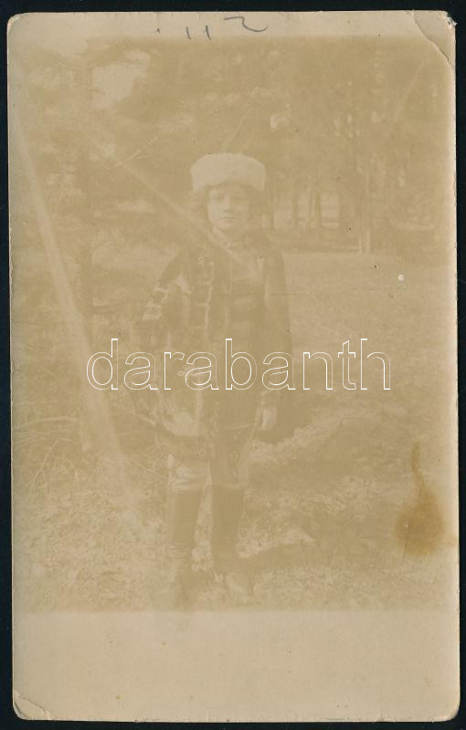 Beschreibung: cca 1910 Fiú díszmagyarban, fotólap, sarkain törésnyomok, 13×9 cm