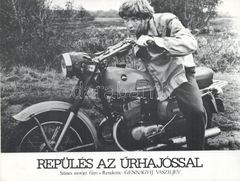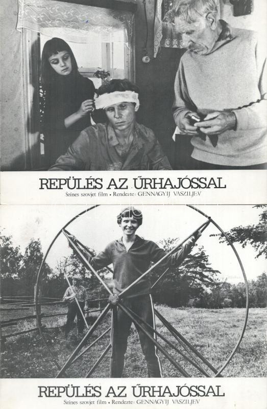 cca 1989 előtt készült, ,,Repülés az űrhajóssal" című szovjet film jelenetei és szereplői, 3 db produkciós filmfotó (vitrinfotó, lobbyfotó) nyomdatechnikával sokszorosítva kartonpapírra, egyoldalas nyomással, a használatból eredő (esetleges) kisebb hibákkal, 18x24 cm