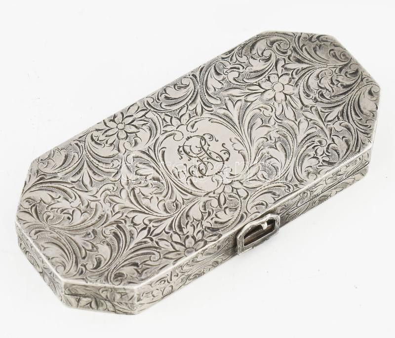 Antik monogramos ezüst (Ag) pudrié, belső tükörrel, jelzett, bruttó 79... https://www.darabanth.com/de/476-Fernauktion/476.0/Juwellen-und-Kunstobjekte-aus-Edelmetall/Juwellen-und-Kunstobjekte-aus-Edelmetall~1500001/Antik-monogramos-ezust-Ag-pudrie-belso-tukorrel-jelzett-brutto-79g~II3234248