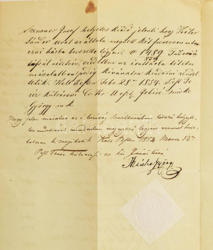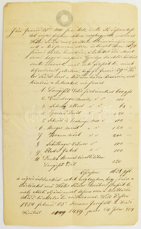1854 Pest, Két Szerecsen és Könyök utcában (Ez utca vonalában épült meg a Sugár út később) álló ház házbérének kimutatása a bérlők felsorolása és engedményezése okmányon 30 kr szignettával