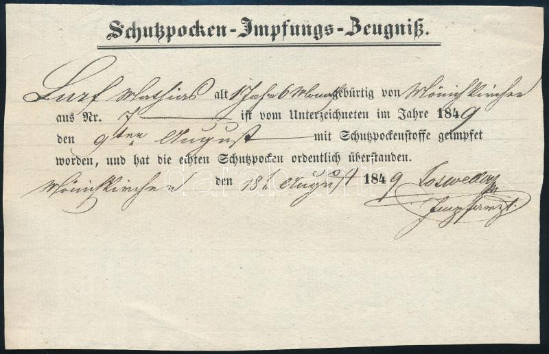 1849 Fehértemplom (Weisskirchen, Bela Crkva), igazolás himlő elleni védőoltásról, német nyelven / Smallpox vaccination certificate (Schutzpocken-Impfungs-Zeugniss)