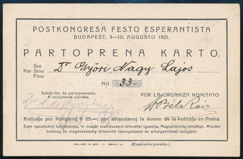 Beschreibung: 1921 Dr. Győri Nagy Lajos híres miskolci eszperantista, az 1919-es Tanácsköztársaság vádbiztosának igazolványa az Eszperantó Kongresszusra, aláírásával