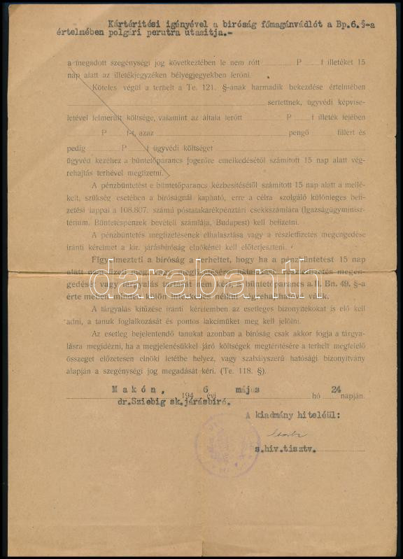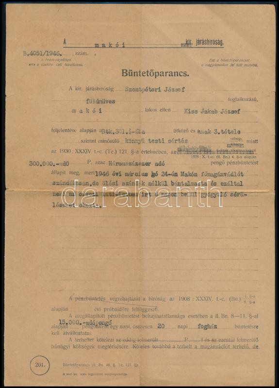 1946 Makó, büntetőparancs 300 000 adópengő pénzbüntetésről ölési szánd... https://www.darabanth.com/de/476-Fernauktion/476.0/Kunst-Dokumente-andere-Sammelgebiete/Dokument~500021/1946-Mako-buntetoparancs-300-000-adopengo-penzbuntetesrol-olesi-szandek-nelkuli-bantalmazasert~II3235588