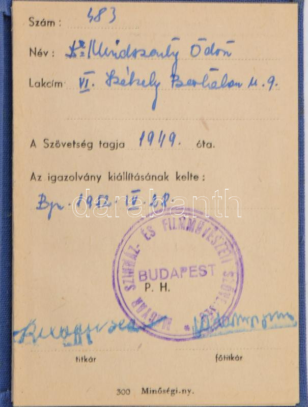 1952 Arcképes Színházi és Filmművészeti Szövetség igazolvány operaének... https://www.darabanth.com/de/476-Fernauktion/476.0/Kunst-Dokumente-andere-Sammelgebiete/Dokument~500021/1952-Arckepes-Szinhazi-es-Filmmuveszeti-Szovetseg-igazolvany-operaenekes-reszere~II3237746