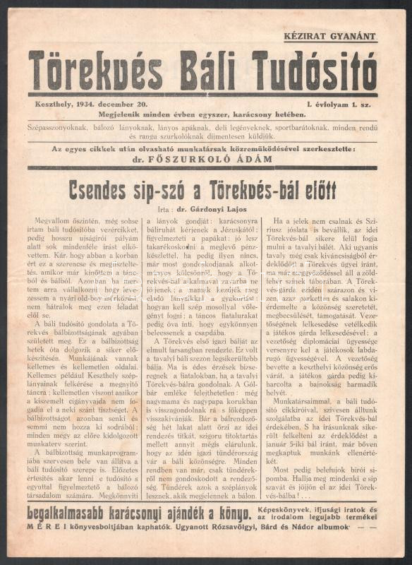 1934 Törekvés Báli Tudósító I. évf. 1. sz. (induló szám), Keszthely, 1934. dec. 20., szerk.: "dr. Főszurkoló Ádám". "Kézirat gyanánt". Keszthely, Mérei Ignác-ny., 8 p. Egy-két lap kissé foltos, egyébként jó állapotban. (Lehet, hogy több száma nem jelent meg. Ritka!)