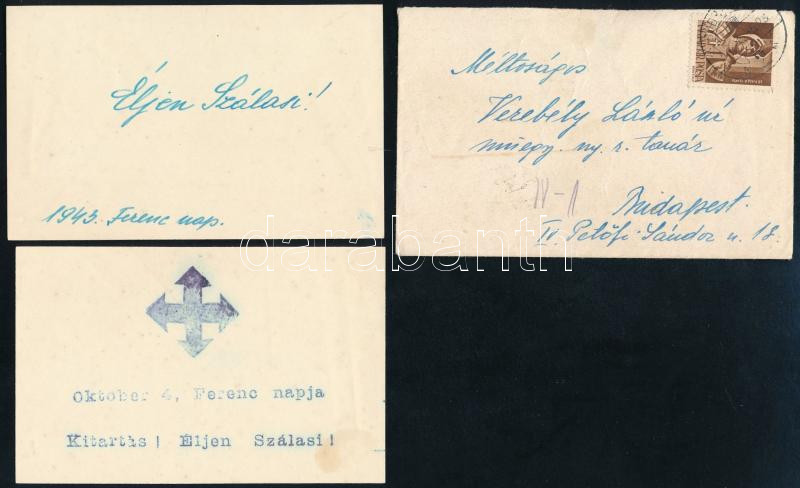 Beschreibung: 1943 Szálasi Ferencet éltető, nyilaskeresztes röplapok, Ferenc nap alkalmából, hozzá borítékkal
