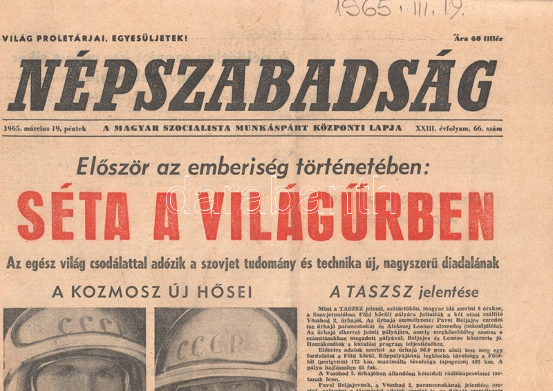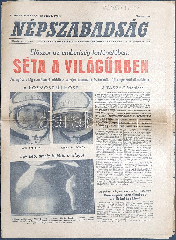 [Folyóirat] ,,Először az emberiség történetében. Séta a világűrben. Az egész világ csodálattal adózik a szovjet tudomány és technika új, nagyszerű diadalának". A Népszabadság politikai napilap lapszáma a Voszhod-2 űrhajó, a második szovjet többszemélyes űrhajó útjáról, a nyolcadik szovjet űrrepülésről. (XXIII. évfolyam, 66. szám, 1965. március 19.) Budapest, 1965. Szikra Lapnyomda. 9 + [3] p. Folio. A második világháborút követően jelentős fegyverkezési verseny kezdődött az Egyesült Államok és a Szovjetunió között. Ennek a versengésnek az eredménye a nyugati világot sokkoló Szputnyik-1 műhold fellövése 1957 októberében, melyet a szovjet hírközlés nagy diadallal jelentett be. Újabb diadalnak számított szovjet oldalon - és a nyugati szorongás újabb epizódját szolgáltatta - az első űrrepülések sora, melyeket szovjet űrhajósok hajtottak végre: a Vosztok-1 űrhajó fedélzetén Jurij Gagarin 1961. április 12-én másfél órás űrrepülésével egy teljes fordulatot tett meg a Föld körül, őt követte 1961 augusztusában German Tyitov a Vosztok-2 űrhajón 17 teljes Föld-fordulattal. A harmadik (és negyedik) űrrepülésre még merészebb tervet tűzött ki a szovjet vezetés: több napon át tartó keringést, mégpedig két-két szovjet űrhajó, 1962 augusztusában a Vosztok-3 és Vosztok-4, 1964 júniusában pedig a Vosztok-5 és a Vosztok-6 részvételével (utóbbi páros repülés az első női űrhajós, Valentyina Tyereskova részvétele miatt ment szenzációszámba). Bár a szovjet űrhajózás az addigi hat úttal számos tájékozódási, vezérlési, kommunikációs és egészségügyi kérdésre választ kapott, ám továbbra is megoldatlan maradt a többszemélyes űrutazás, az űrséta és az űrrandevú kérdése, melyeket egyenként is meg kellett oldani a távlati cél, a Hold eléréséhez. A párhuzamosan zajló amerikai kísérleteket megelőzve 1964 októberében a Voszhod-1 űrhajó fedélzetén három szovjet űrhajós zsúfolódott össze és végezte űr-kísérleteit sikeresnek bizonyuló 24 órás repülése során. A szovjet űrprogram következő célja volt az űrséta megvalósítása volt, azaz annak a lehetőségnek a gyakorlati próbája, hogy az űrhajós az űrben rövid időre el tudja hagyni űrhajóját. A Voszhod-2 űrhajó építése elsődlegesen ezt a célt szolgálta. Pavel Beljajev parancsnokkal és Alekszej Leonov fedélzeti mérnökkel a fedélzetén a Voszhod-2 1965. március 18-án állt Föld körüli pályára, és egynapos küldetése során Alekszej Leonov valóban elvégezte a történelem első sikeres űrsétáját, mely 12 percig tartott. Az eseményről televíziós felvétel is készült, melynek egy képkockáját nyitóoldalán hozza lapszámunk. Az illusztrált lapszámban a szovjet hírügynökség alaposan megszűrt jelentése, az űrhajósok életrajza, beszélgetésük Leonyid Brezsnyev első titkárral, sajtóvisszhang, valamint további spekulációk a szovjet űrprogram további céljairól, jelesül az űrállomás létesítéséről. Lapszámunk további részeiben belpolitikai hírek, külföldi választási várakozások a népi demokratikus áttörés jegyében, illetve a vietnami nép harci naplója. A küldetés vége előtt megjelenő lapszám nem boncolgathatja a visszatérés körülményeit, illetve érthető módon mellőzi a küldetés során felmerült óriási bonyodalmak hírzárlat alá vont boncolgatását, mely hibák és malőrök végül a Voszhod-projekt végleges leállításához vezetett, és helyette a későbbi Szojuz-program került előtérbe. Jó állapotú lapszám.