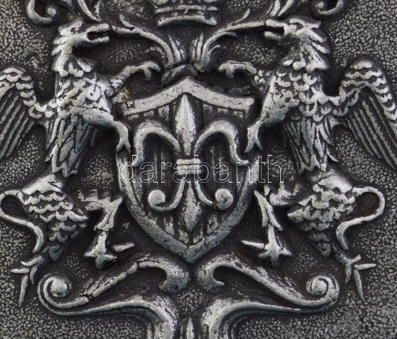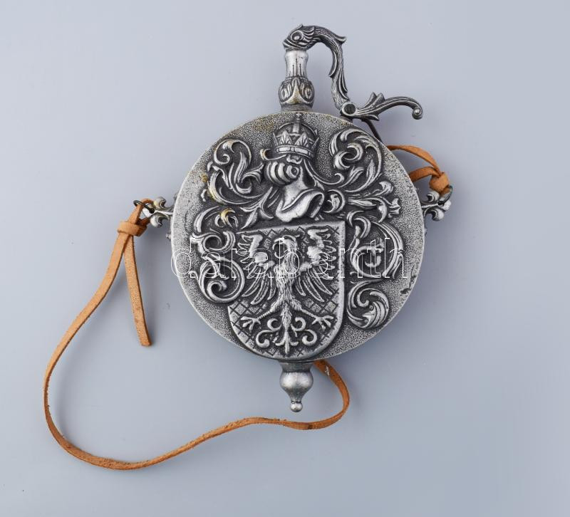 Retro német lőportartó edény, címermintával díszített, bőr akasztóval,... https://www.darabanth.com/de/476-Fernauktion/476.0/Kunst-Dokumente-andere-Sammelgebiete/Flohmarkt~500014/Retro-nemet-loportarto-edeny-cimermintaval-diszitett-bor-akasztoval-23x18-cm~II3237023