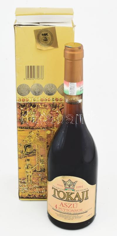 1991, Tokaji aszú, 4 puttonyos, 13%, 0,5l, bontatlan, díszdobozban. https://www.darabanth.com/de/476-Fernauktion/476.0/Kunst-Dokumente-andere-Sammelgebiete/Vintage-Weine-Getranke~500018/1991-Tokaji-aszu-4-puttonyos-13-0-5l-bontatlan-diszdobozban~II3234245