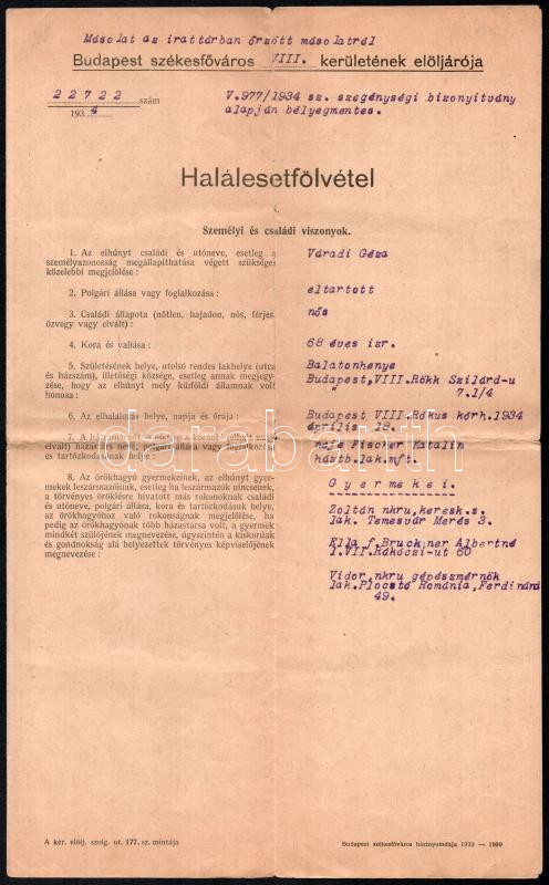 1934 Bp., Haláleset felvétel Váradi Géza 68 éves izraelita személyről https://www.darabanth.com/de/476-Fernauktion/476.0/Kunst-Dokumente-andere-Sammelgebiete/Werbungen~2000116/1934-Bp-Halaleset-felvetel-Varadi-Geza-68-eves-izraelita-szemelyrol~II3235065