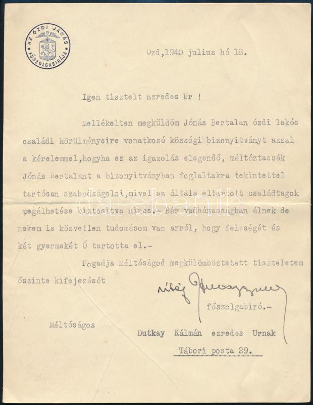 1940 Dutkay Kálmán ezredes tábori posta 29. számra küldött levél vitéz... https://www.darabanth.com/de/476-Fernauktion/476.0/Kunst-Dokumente-andere-Sammelgebiete/Werbungen~2000116/1940-Dutkay-Kalman-ezredes-tabori-posta-29-szamra-kuldott-level-vitez-Hubay-Gyula-sajat-kezu~II3236085
