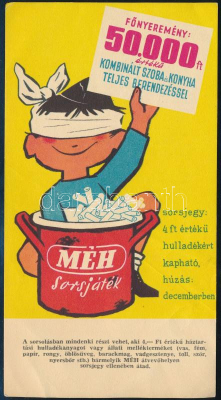 1957 MÉH sorsjáték szórólapja, hajtásnyommal https://www.darabanth.com/de/476-Fernauktion/476.0/Kunst-Dokumente-andere-Sammelgebiete/Werbungen~2000116/1957-MEH-sorsjatek-szorolapja-hajtasnyommal~II3233015