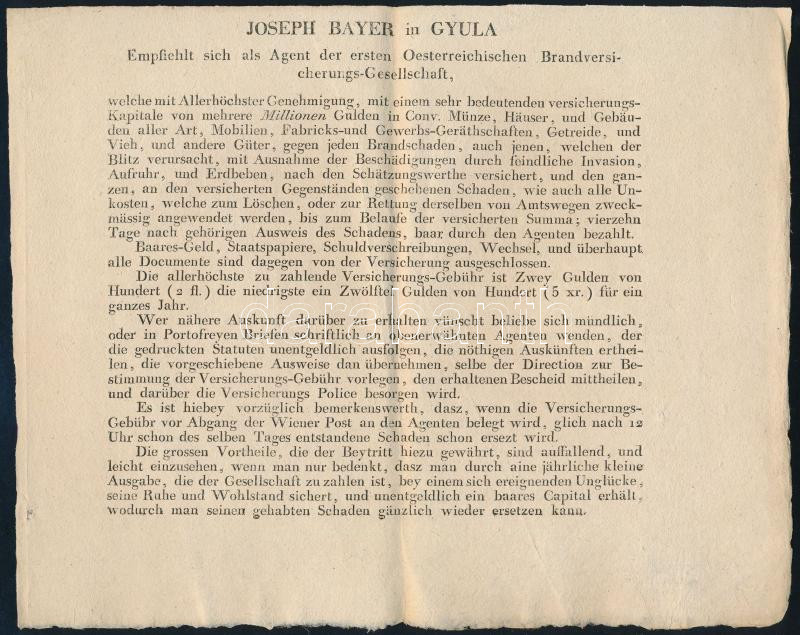 cca 1830-60 Gyula, Joseph Bayer, az Első Osztrák Tűzbiztosító Társaság (Ersten österreichischen Brandversicherungs-Gesellschaft) ügynökének német ny. nyomtatott bemutatkozó levele, papír. Hajtott. 42x28,5 cm