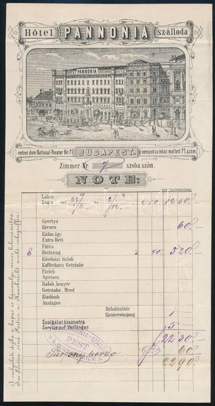 Beschreibung: cca 1870 Pest, Hotel Pannonia szálloda által kiállított jegyzék bélyegzéssel, díszes fejléces papíron, a szállodáról készült grafikával illusztrálva