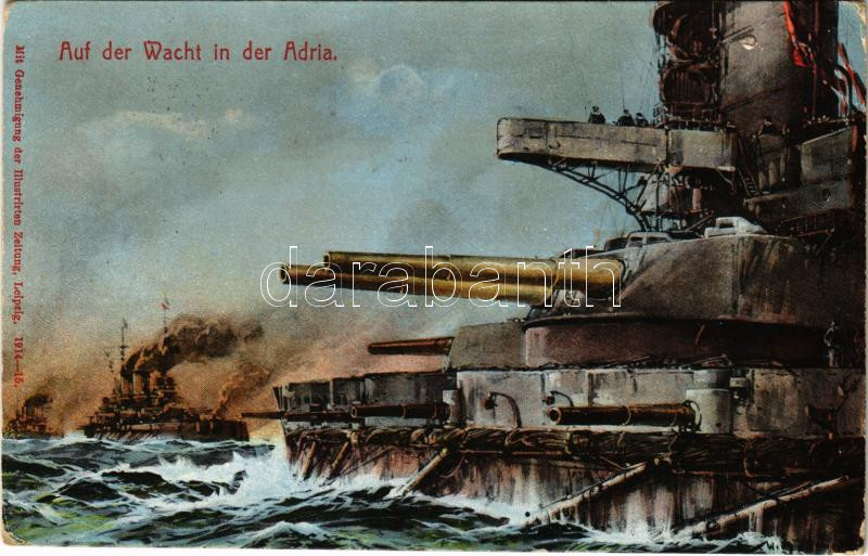 1915 Auf der Wacht in der Adria. K.u.K. Kriegsmarine / WWI Austro-Hungarian Navy art postcard, battleships on watch over the Adriatic Sea s: Willy Stöwer + "K.U.K. KRIEGSMARINE S.M.S. VIRIBUS UNITIS"