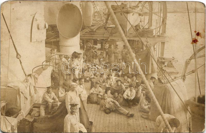 1916 SMS Kaiserin und Königin Maria Theresia osztrák-magyar haditengerészet páncélos cirkáló fedélzete matrózokkal / K.u.K. Kriegsmarine Matrosen / Austro-Hungarian Navy SMS Kaiserin und Königin Maria Theresia armored cruiser with mariners on deck. photo (fl)