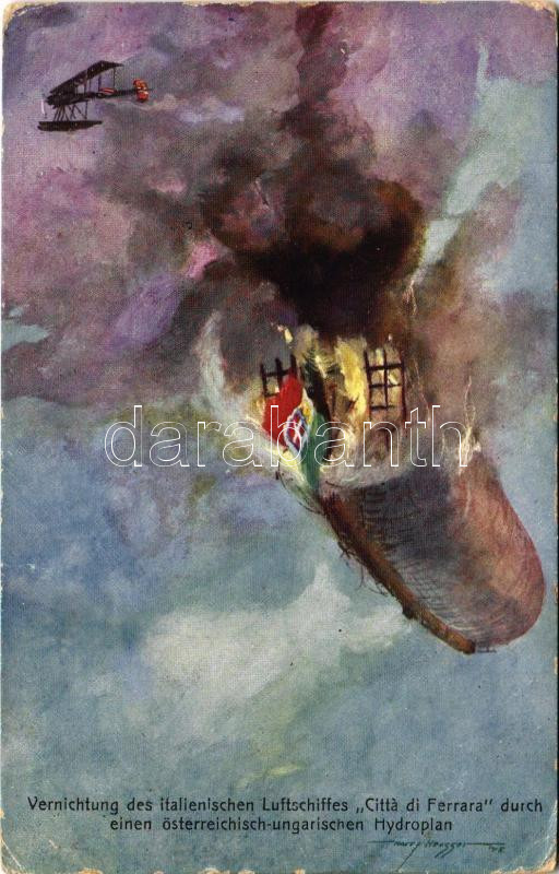 1916 Vernichtung des italienischen Luftschiffes "Citta di Ferrara" durch einen österreichisch-ungarischen Hydroplan. K.u.K. Kriegsmarine Seeflugzeug / WWI Austro-Hungarian Navy art postcard, destruction of Italian airship "Citta di Ferrara" by an Austro-Hungarian Navy seaplane, naval aircraft. B.K.W.I. 259-145. s: Harry Heusser + "K.U.K. KRIEGSMARINE SM SCHIFF KOMET" (EB)