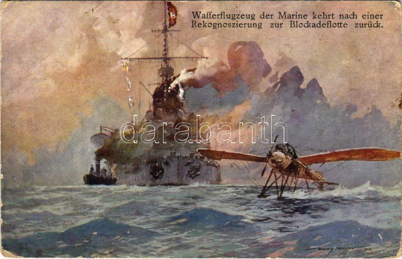 1916 Wasserflugzeug der Marine kehrt nach einer Rekognoszierung zur Blockadeflotte. K.u.K. Kriegsmarine. Offizielle Postkarte des Österreichischen Flottenvereines zu Gunsten der Kriegsfürsorge / Osztrák-Magyar Haditengerészet flotta és hidroplán / WWI Austro-Hungarian Navy art postcard, seaplane s: Harry Heusser + "K.U.K. KRIEGSMARINE SM SCHIFF KOMET" (kopott sarkak / worn corners)