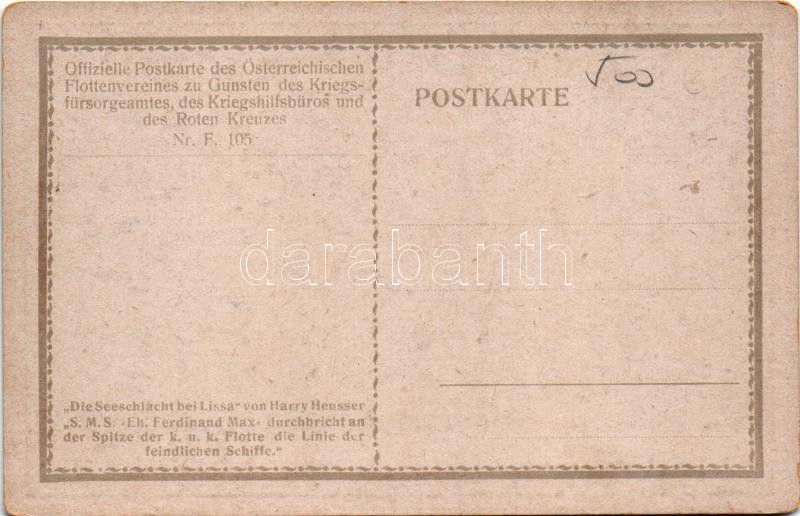 Die Seeschlacht bei Lissa. SMS Erzherzog Ferdinand Max durchbricht an der Spitze der k.u.k. Flotte die Linie der feindlichen Schiffe. K.u.K. Kriegsmarine. Kriegshilfsbüro Nr. F. 105. / Az SMS Erzherzog Ferdinand Max csatahajó áttöri az ellenséges hajók vonalát a lissai csatában / Battle of Lissa (1866), flagship SMS Erzherzog Ferdinand Max breaks through the enemy ships line s: Harry Heusser