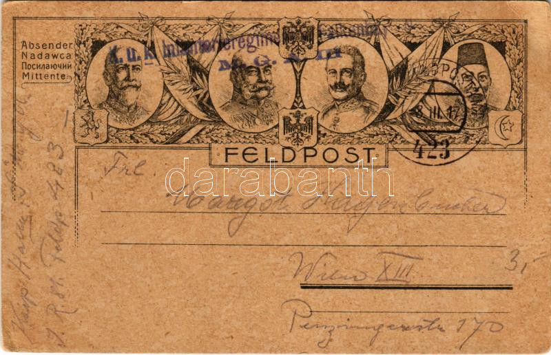 1917 Első világháborús Tábori Postai Levelezőlap a Központi Hatalmak uralkodóival: V. Mehmed, I. Ferdinánd, II. Vilmos, I. Ferenc József / WWI Austro-Hungarian K.u.K. military field postcard, Viribus Unitis and Central Powers propaganda: Mehmed V, Ferdinand I of Bulgaria, Wilhelm II, Franz Joseph I of Austria. Feldpost (EK)