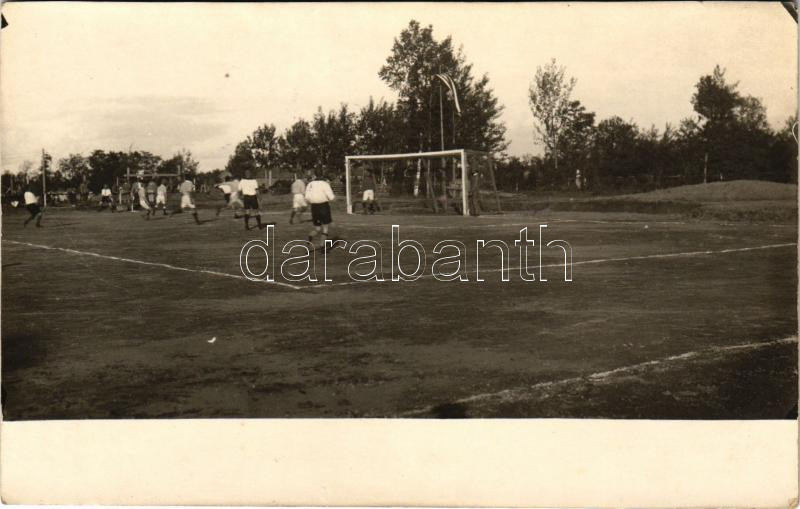 1919 Krasznaja Recska, Rjecska, Krasnaia- Rjetschka (Habarovszk, Khabarovsk); Az ekkor már amerikai fennhatóság alatt hadifogolytábor. 1919. június 19. Úrnapja, pályanyitó foci meccs, labdarúgás. Fotólap 14x9 cm Hátoldalán Stobbe Kálmán (1883-1936) építőmester, labdarúgó, a magyar válogatott edzője pecsétjével / Japanese-Russian POW (prisoner of war) camp, first football match. photo (fl)