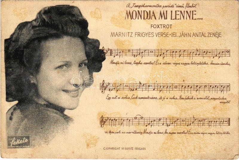Beschreibung: Mondja mi lenne... Marnitz Frigyes verse, Ifj. Jáhn Antal zenéje. A "Tangóharmonika parádé" című filmből (fa)