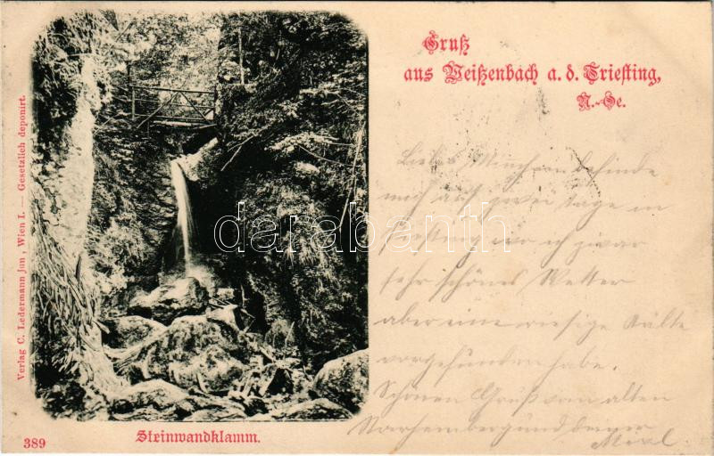 1898 (Vorläufer) Steinwandklamm. Gruss aus Weißenbach an der Triesting https://www.darabanth.com/de/477-Fernauktion/477.0/Ansichtskarten/Osterreich~1500055/1898-Vorlaufer-Steinwandklamm-Gruss-aus-WeiC39Fenbach-an-der-Triesting~II3250428