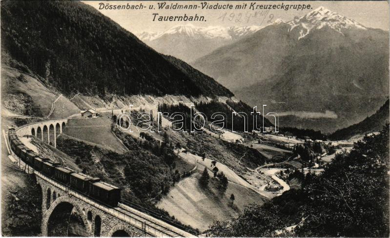 Beschreibung: Tauernbahn, Dössenbach- und Waldmann Viaducte mit Kreuzeckgruppe / railway viaducts, train