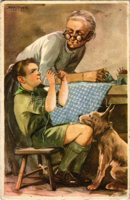 1941 A cserkész feljebbvalóinak jószívvel engedelmeskedik. Cserkész levelezőlapok kiadóhivatala / Hungarian boy scout art postcard s: Márton L. (lyukak / pinholes)