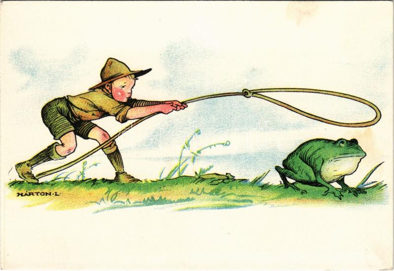 Beschreibung: Cserkész békával. Magyar Cserkészszövetség kiadása. Klösz Gy. és Fia / Hungarian boy scout art postcard with frog s: Márton L. (fl)