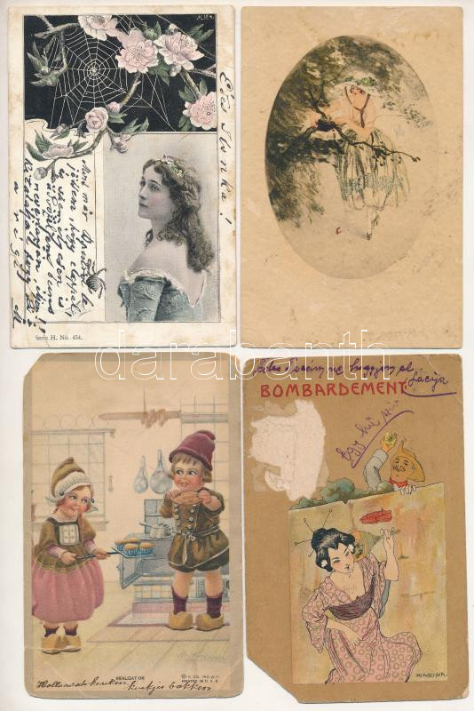50 db RÉGI sérültm hiányos, törött, stb. 1899-1945 közötti képeslap, közte sok hosszú címzéses, lithók, sok szignós pl. Raphael Kirchner, S. Hardy art deco, erotikus italian gravures, Biczó, titkosírásos lap, Feiertag, lovak, némi topográfia, művész és üdvözlő