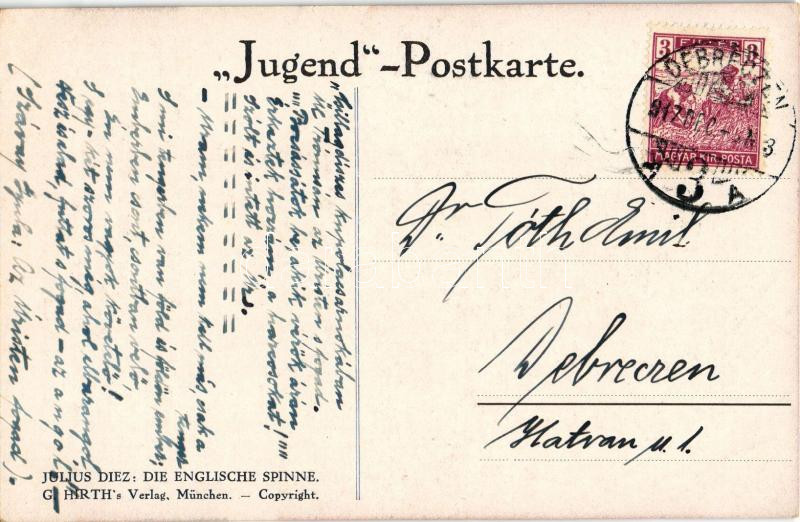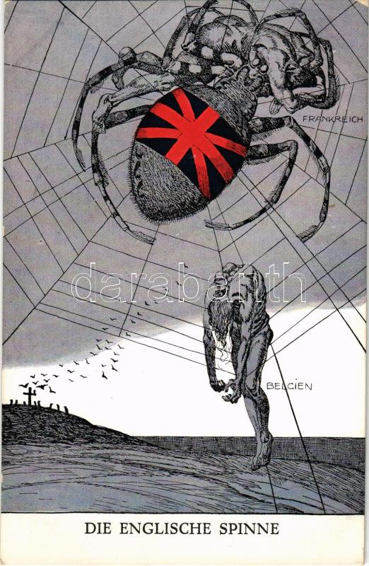 1917 Die englische Spinne: Frankreich, Belgien. G. Hirth's Verlag, München / Első világháborús német antant-ellenes katonai propaganda, az angol pók hálójában Franciaország és Belgium / WWI German Anti-Entente Powers military propaganda, Belgium and France in the web of the British spider s: Julius Diez