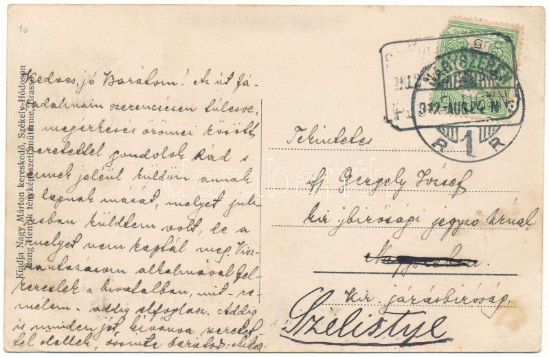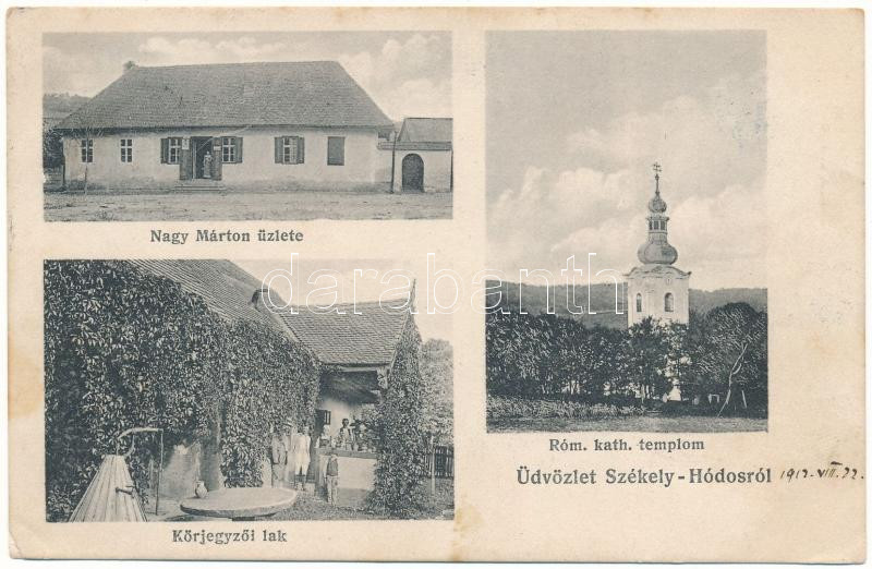 1912 Székelyhodos, Székely-Hódos, Hodos, Hodosa; Körjegyzői lak, Római katolikus templom, Nagy Márton üzlete és saját kiadása. Lang Henrik fényképészeti műterme / notary's house, Catholic church, publisher's shop (EK)
