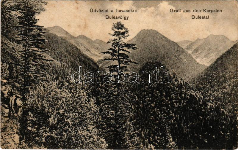 Beschreibung: Fogarasi-havasok (Fogarasi Kárpátok), Fogarascher Karpathen, Muntii Fagarasului; Üdvözlet a havasokról, Bulea völgy. Fleissig Jakab kiadása / Gruß aus den Karpaten, Buleatal (fl)