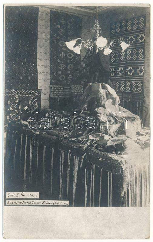 Nagyszeben, Hermannstadt, Sibiu; Expositia Maria Cosma 3. Martie 1912. Sala II Banatana / kiállítás, Bánáti szoba, erdélyi folklór / exhibition, Transylvanian folklore from Banat. photo (fl)