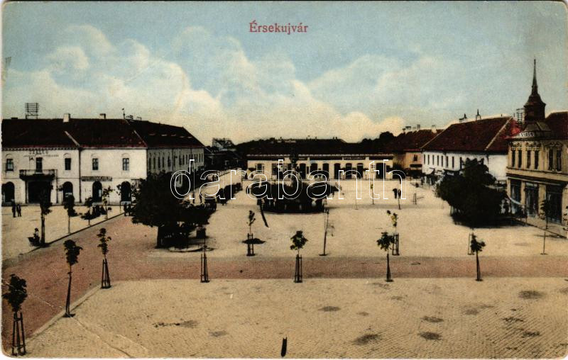 Beschreibung: 1915 Érsekújvár, Nové Zámky; Arany Oroszlán szálloda, Nemzeti szálloda, üzletek / hotels, shops (EB)