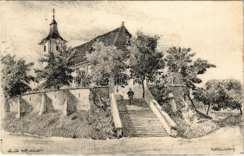 Beschreibung: Felsőleszéte, Leszéte, Podola, Podolie (Vágújhely, Nové Mesto nad Váhom); templom. Kézzel rajzolt lap 1907-ből / church. Hand-drawn art (fl)