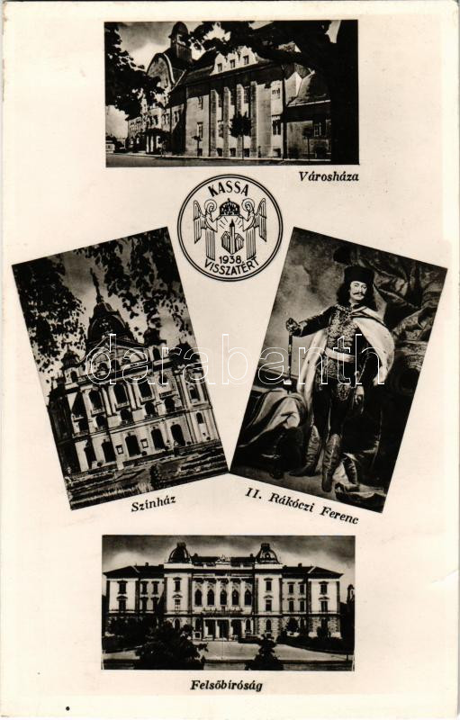 Kassa, Kosice; "1938 Kassa visszatért" bevonulás, városháza, színház, II. Rákóczi Ferenc, Felsőbíróság. Fenyves Andor kiadása / entry of the Hungarian troops, town hall, theatre, Francis II Rákóczi, court (vágott / cut)