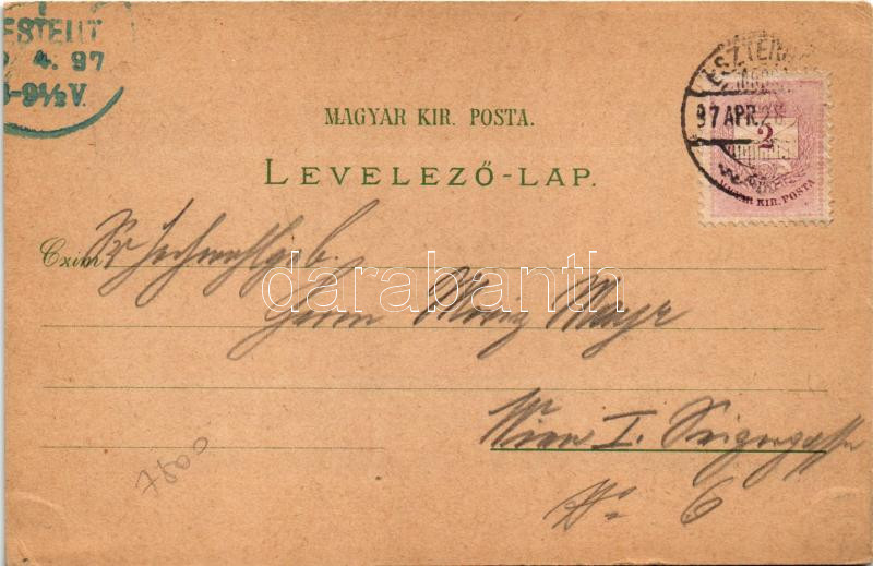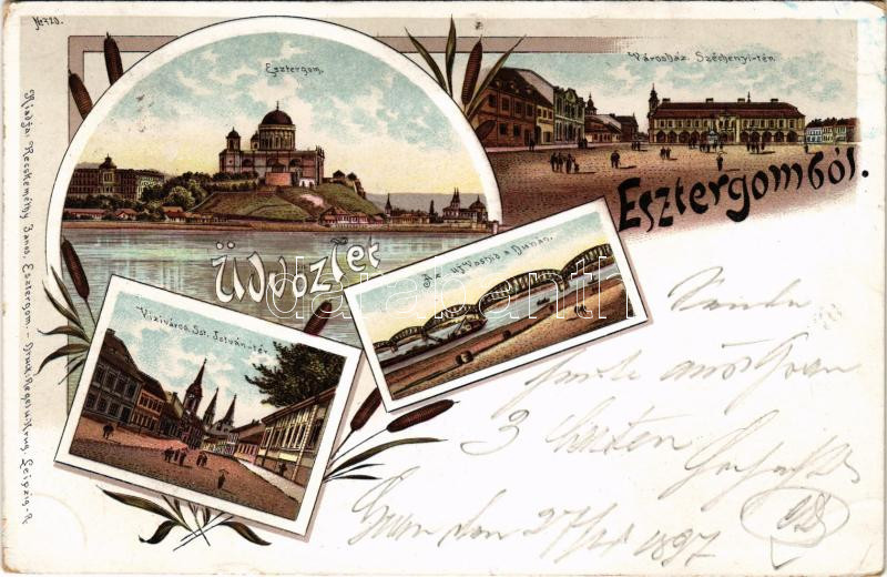 Beschreibung: 1897 (Vorläufer) Esztergom, Széchenyi tér, városháza, bazilika, Víziváros, Szt. István tér. Kecskeméthy János No. 720. Art Nouveau, floral, litho (EK)