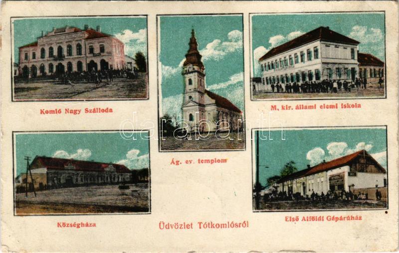 1922 Tótkomlós, Községháza, Nagy Szálloda, Evangélikus templom, M. kir... https://www.darabanth.com/de/477-Fernauktion/477.0/Ansichtskarten/Ungarn~1500005/1922-Totkomlos-Kozseghaza-Nagy-Szalloda-Evangelikus-templom-M-kir-allami-elemi-iskola-~II3249301