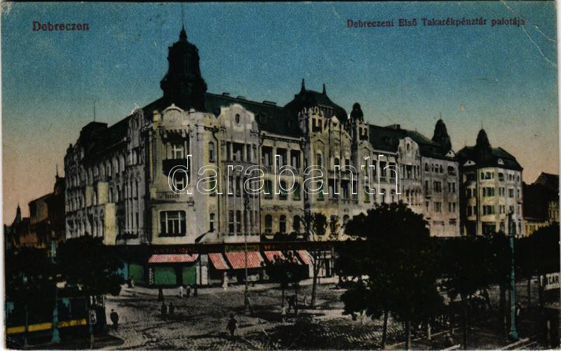 1926 Debrecen, Debreczeni Első Takarékpénztár palotája, Kontsek Kornél... https://www.darabanth.com/de/477-Fernauktion/477.0/Ansichtskarten/Ungarn~1500005/1926-Debrecen-Debreczeni-Elso-Takarekpenztar-palotaja-Kontsek-Kornel-uzlete-villamos-VasC3~II3244253