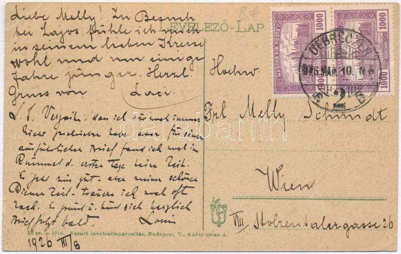 Beschreibung: 1926 Debrecen, Debreczeni Első Takarékpénztár palotája, Kontsek Kornél üzlete, villamos. Vasúti levelezőlapárusítás 18. sz. 1918. (EB)
