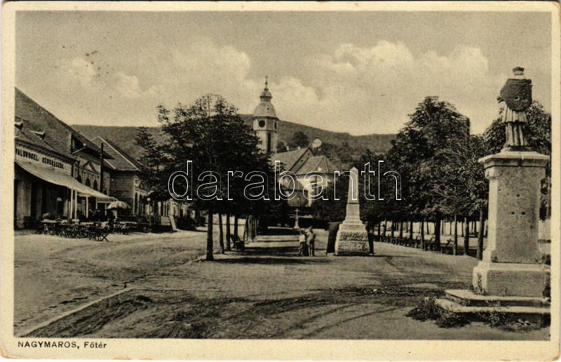 Beschreibung: 1933 Nagymaros, Nepomuki Szent János szobor, Hősök szobra, Waldvogel cukrászda. Virág István kiadása