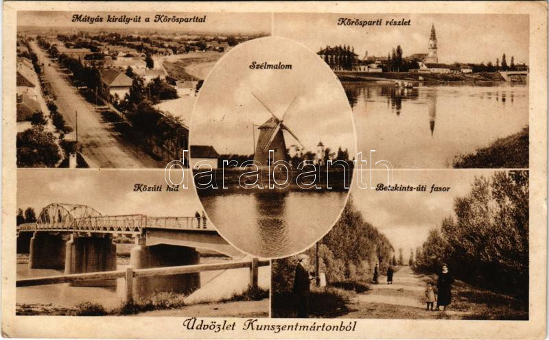 Beschreibung: 1935 Kunszentmárton, Mátyás király út a Körös-parttal, szélmalom, Körös-parti részlete, közúti híd, Betekints úti fasor. Benke Boldizsár kiadása (ázott / wet damage)